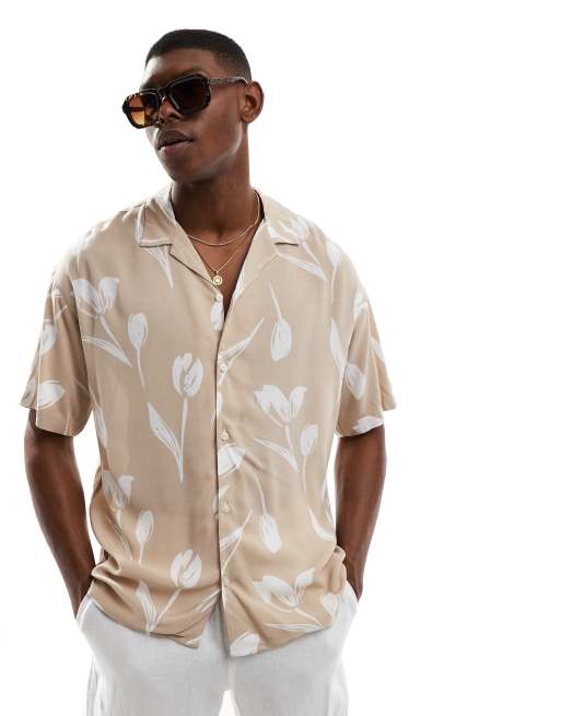 Jack & Jones - Overhemd met reverskraag, bloemenprints en korte mouwen in beige