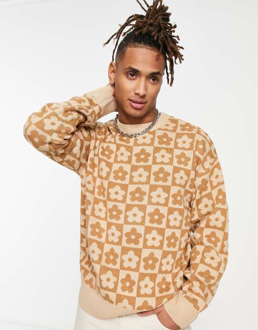 Jack & Jones - Oversized trui van geblokt en gebloemd jacquard in beige