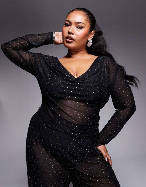 Jaded Rose Plus - Doorschijnende top met lange mouwen en hotfix in zwart, deel van co-ord set