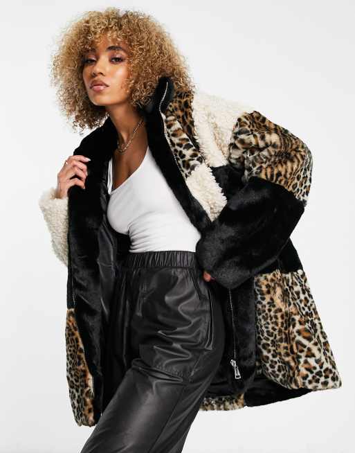 Jayley - Midi-jas van patchwork imitatiebont met luipaardprint in crème en zwart