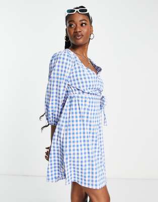 JDY - Mini jurk met gingham ruit, overslag en gestrikte taille in blauw