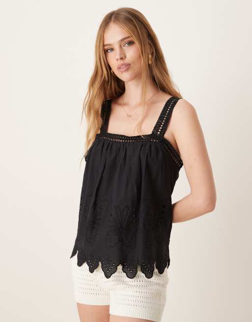 JDY - Top met geschulpte rand, gehaakte bandjes en geborduurd detail in zwart