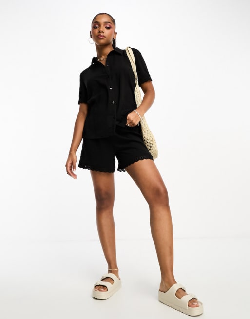 Only - Co-ord set van short en overhemd met kanten afwerking in zwart