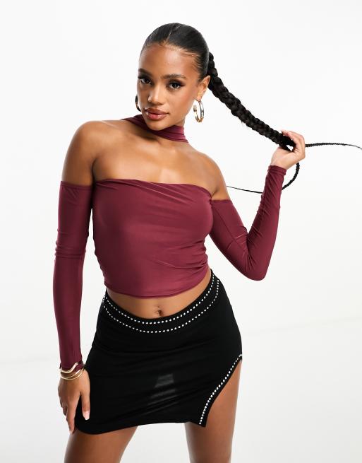 Kaiia - Bardot-top met chokerdetail in bordeauxrood