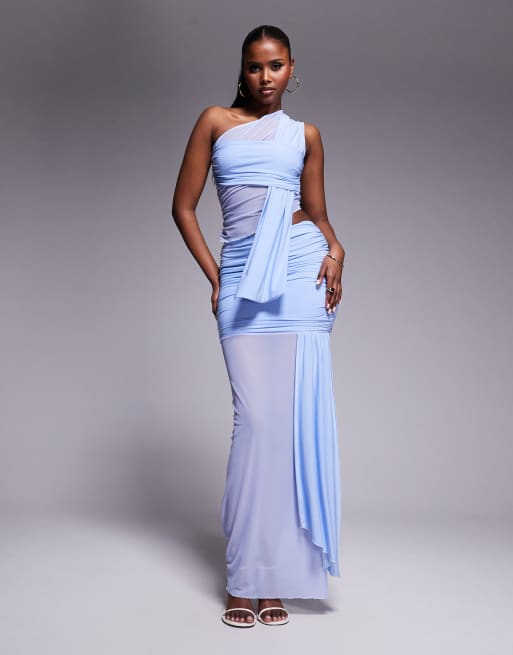 Kaiia - Co-ord set met slinky en mesh top met blote schouder en maxirok in lichtblauw