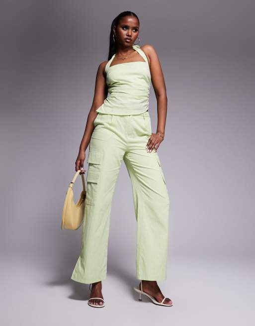 Kaiia - Co-ord set van linnenlook haltertop en cargobroekbroek in saliegroen