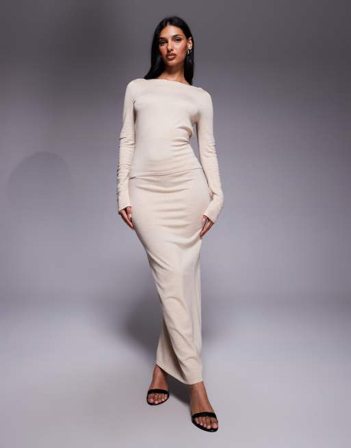 Kaiia - Exclusive - Co-ord set van fijngebreide top met gedrapeerde halslijn, gestrikte achterkant en lange mouwen en maxirok in lichtbeige
