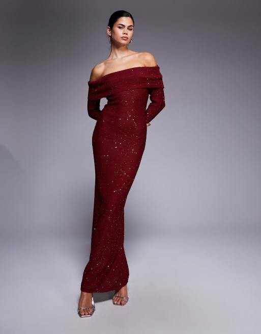 Kaiia - Exclusive - Gebreide maxi jurk met blote schouders, lange mouwen en lovertjes in bordeauxrood