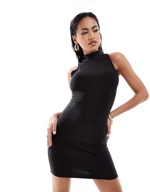 Kaiia - Exclusive - Mini bodycon jurk van gelaagde gladde stof met racerhals in zwart
