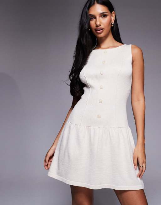 Kaiia - Exclusive - Mouwloze gebreide skater mini-jurk met knopen en wijde hals in crème