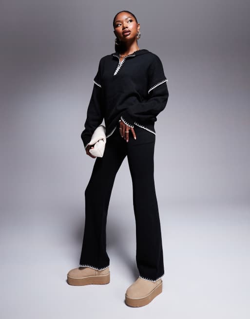 Kaiia - Exclusives - Gebreide broek met wijde pijpen en contrasterende stiksels in zwart, deel van co-ord set
