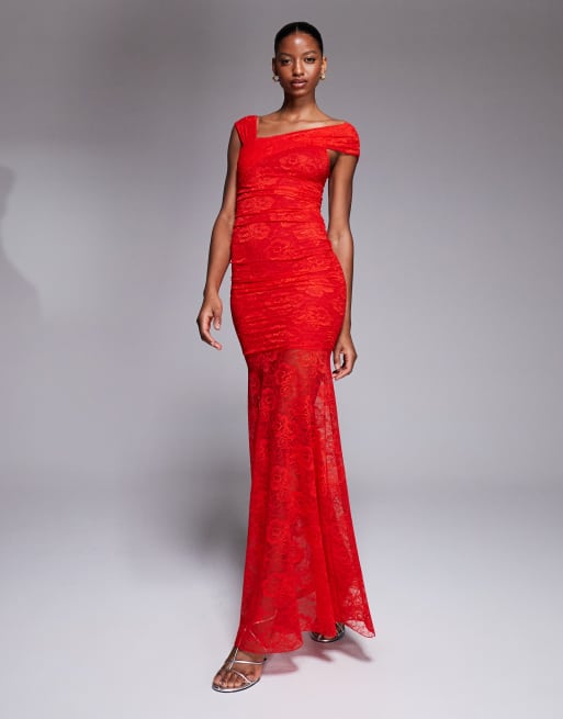 Kaiia - Exclusives - Maxi-jurk van glad dubbellaags doorschijnend kant met asymmetrische blote schouder in rood
