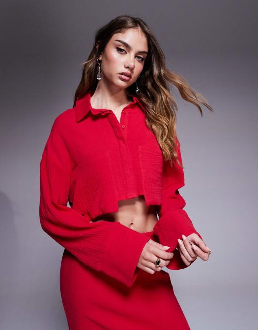 Kaiia - Exclusives - Oversized cropped overhemd van katoen met textuur en gestrikte achterkant in rood, deel van co-ord set