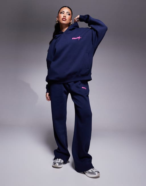 Kaiia - Joggingbroek van katoenmix met wijde pijpen en logo in marineblauw, deel van co-ord set