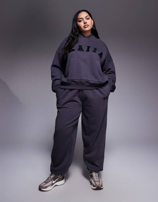 Kaiia - Plus - Joggingbroek van katoenmix met geborduurd logo en aansluitende boorden in donkergrijs, deel van co-ord set