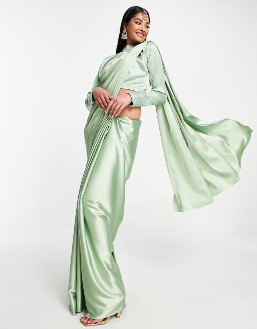 Kanya London - Bruidsmeisjes - Co-ord set met hoogsluitende blouse en sari in saliegroen