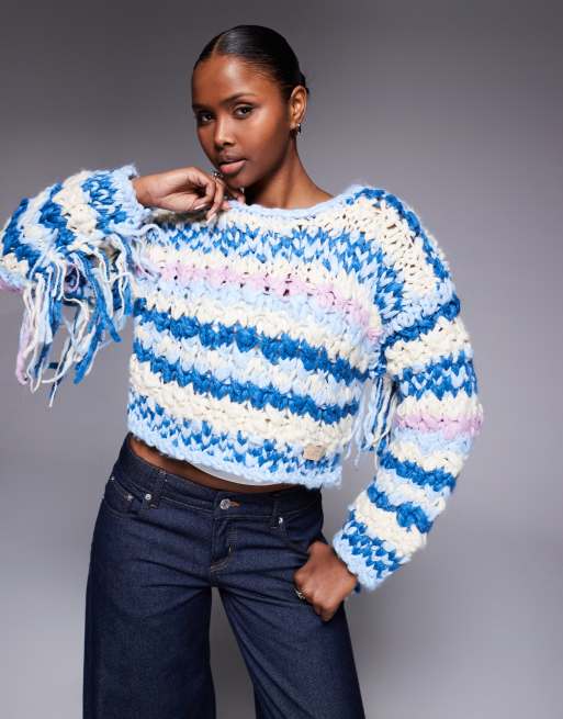 Kiwi & Co - Pixie - Met de hand grofgebreide cropped trui van wol met franjes aan de mouwen in blauwe strepen