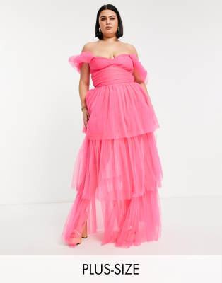 Lace & Beads - Plus - Exclusives - Lange jurk van tule met blote schouders in felroze