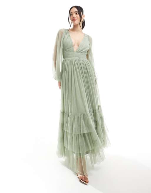 Lace & Beads - Bruidsmeisjes - Madison - Maxi-jurk met lange mouwen in zacht groen