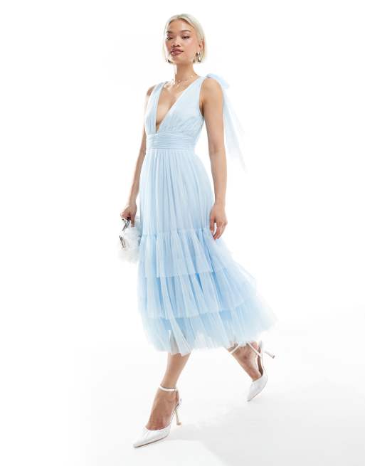 Lace & Beads - Bruidsmeisjes - Madison - Midi jurk met gestrikte schouderbandjes en stroken in poederblauw