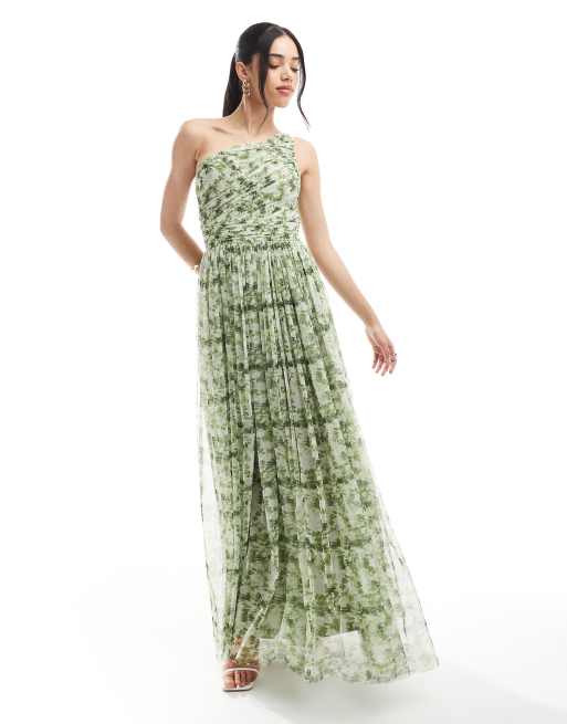 Lace & Beads - Bruidsmeisjes - Maxi-jurk met enkele schouderband en bloemenprint in olijfgroen