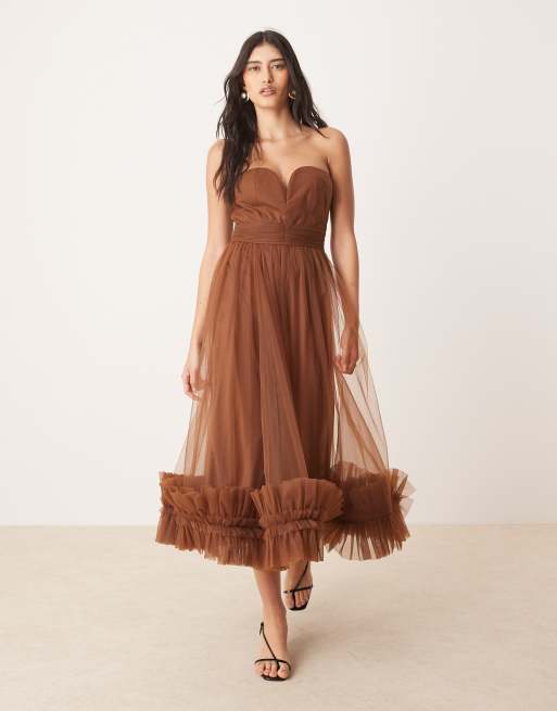 Lace & Beads - Midaxi jurk met korset en rok van tule met ruche aan de zoom in bruin