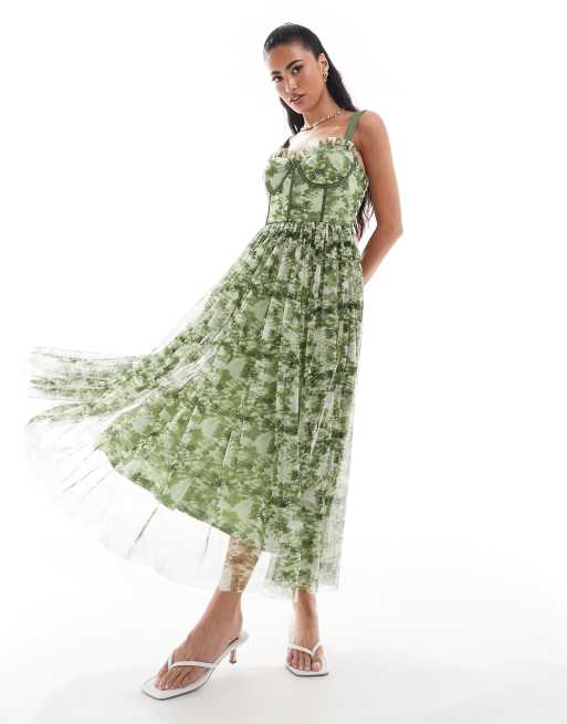 Lace & Beads - Midi jurk van tule met korset in olijfgroene bloemenprint
