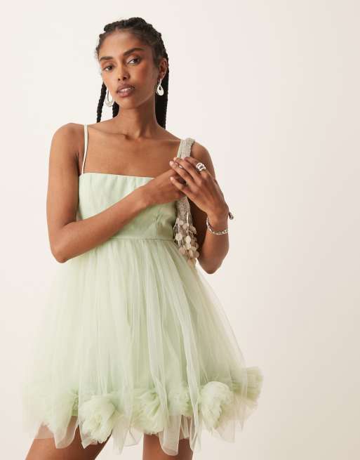 Lace & Beads - Mini babydoll jurk van tule met pofzoom in pistache