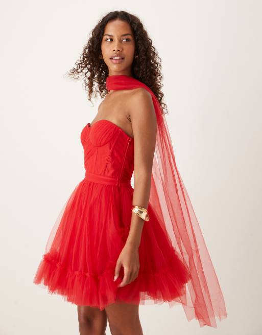 Lace & Beads - Mini-korsetjurk van tule met sjaal om de hals in rood