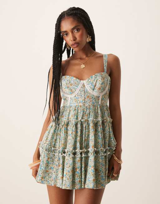 Lace & Beads Petite - Mini korsetjurk met kanten zoom en ruches in fijne bloemenprint