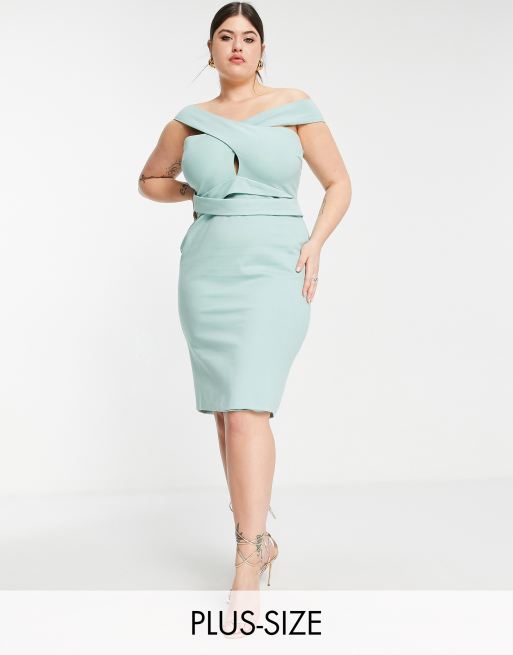 Lavish Alice Plus - Bardot midi jurk met kleine opening in saliegroen
