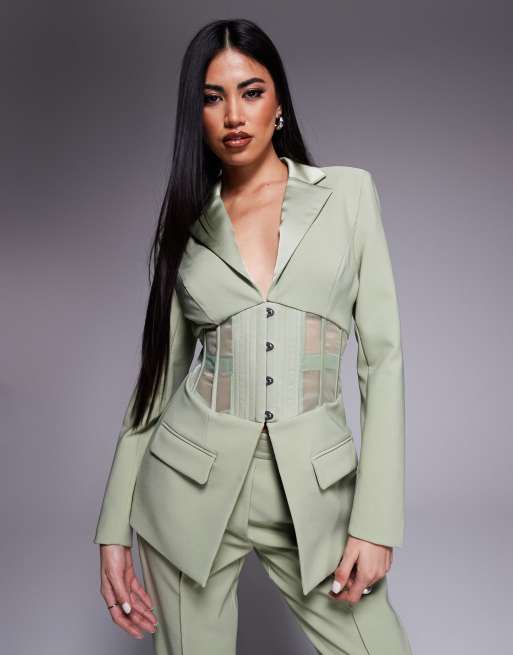 Lavish Alice - Korset blazer van doorschijnend satijn in saliegroen, deel van co-ord set