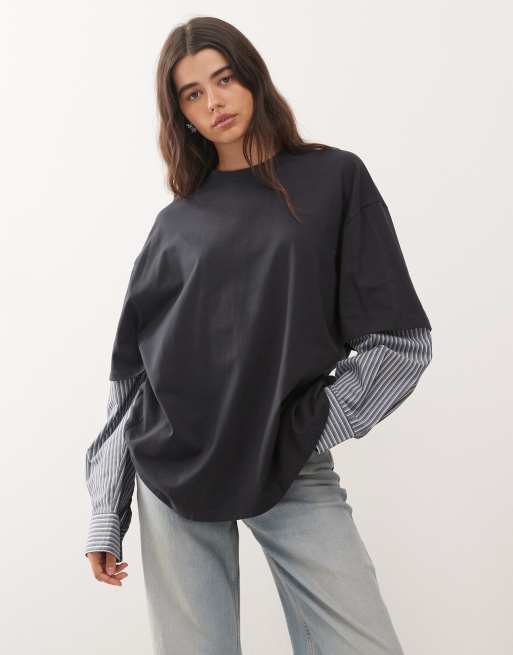 Lioness - 2-in-1 oversized T-shirt overlay en gestreept overhemd met lange mouwen in antracietgrijs strepen