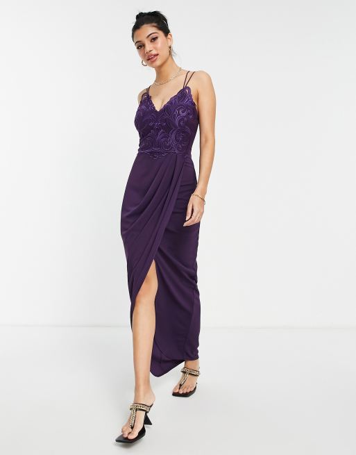 Lipsy - Wijd uitlopende jurk met kanten lijfje en overslag in bordeauxrood