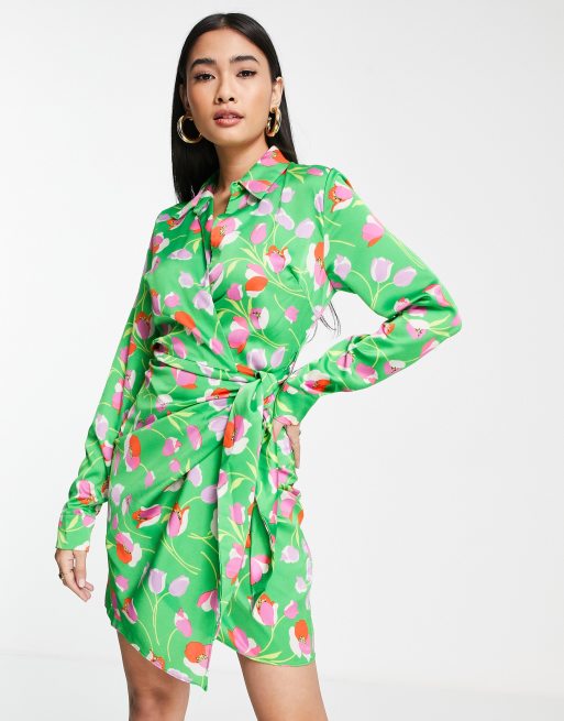 Liquorish - Mini overslagjurk met kraag in felgroen met bloemenprint
