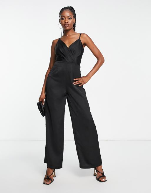 Little Mistress - Satijnen jumpsuit met wijde pijpen en bandjes in zwart