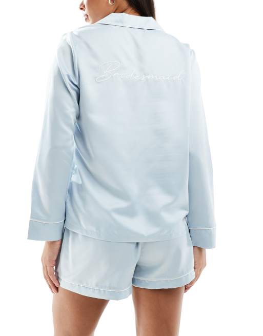 Loungeable - Bruidsmeisjes - Set van satijnen overhemd met lange mouwen en short in blauw