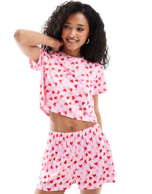 Loungeable - Jersey pyjamaset van T-shirt en short met hartjesprint in roze