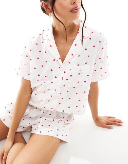 Loungeable - Pyjamaset van dobbystof met overhemd met korte mouwen en short met hartjesprint in ivoorwit