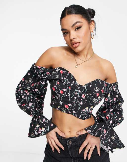 Love & Other Things - Crop top met lange pofmouwen en blote schouders in bloemenprint
