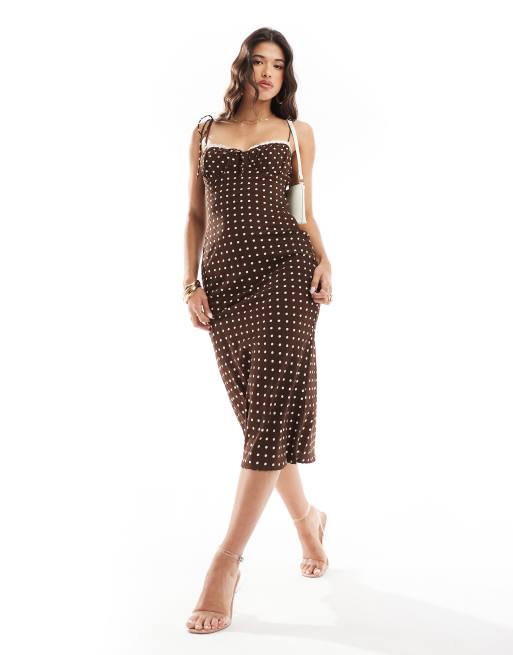 Love Triangle - Midaxi jurk met kanten bies in bruin met polkadots