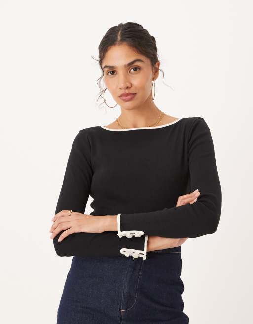 Mango - 100% katoenen top met contrasterend gekleurd randje en lange mouwen in zwart