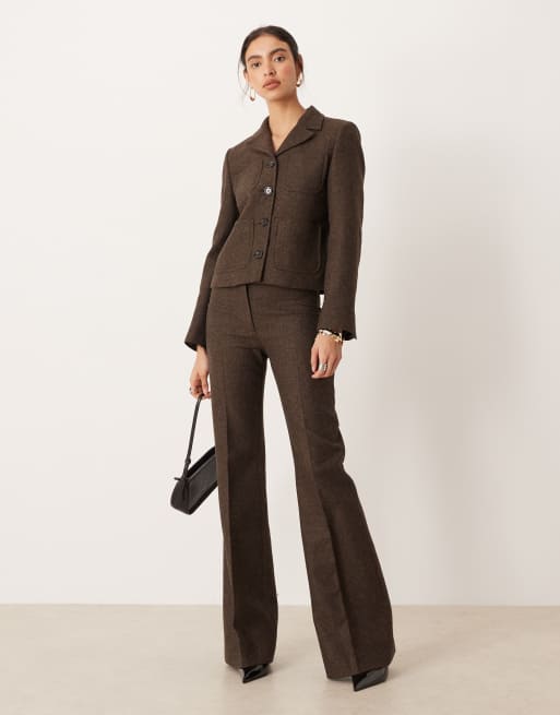 Mango - Camila - Flare-broek met geplooide voorkant van wolmix in chocoladebruin, deel van co-ord set
