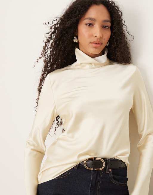Mango - Capsule - Hoogsluitende top van satijn met lange mouwen in crème