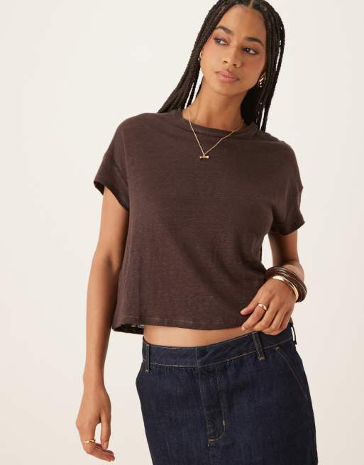 Mango - Cropped linnen T-shirt met ronde hals in chocoladebruin
