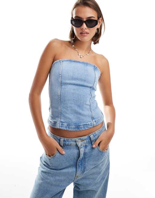 Mango - Denim bandeau-top in lichtblauw