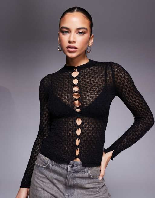 Mango - Featuring Kaia Gerber - Doorschijnende top met uitsnijdingen, lange mouwen en gouden knopen in zwart