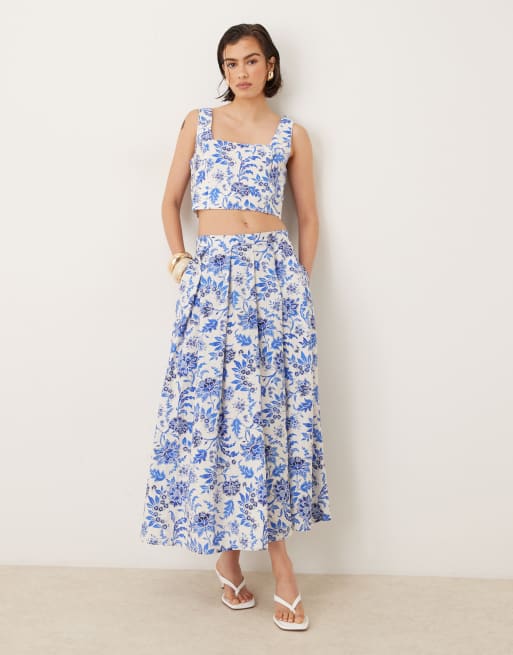 Mango - Geplooide volle maxirok in blauwe bloemenprint
