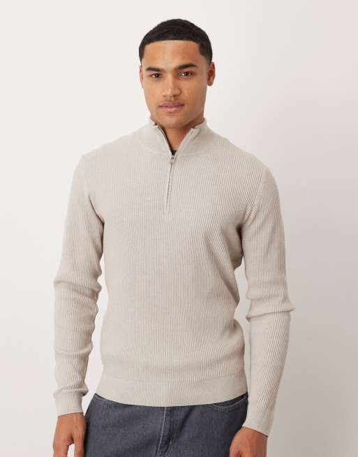 Mango - Geribbelde trui van katoenmix met korte rits in ecru