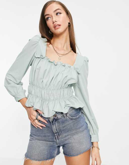Mango - Gesmokte blouse met vierkante hals in saliegroen